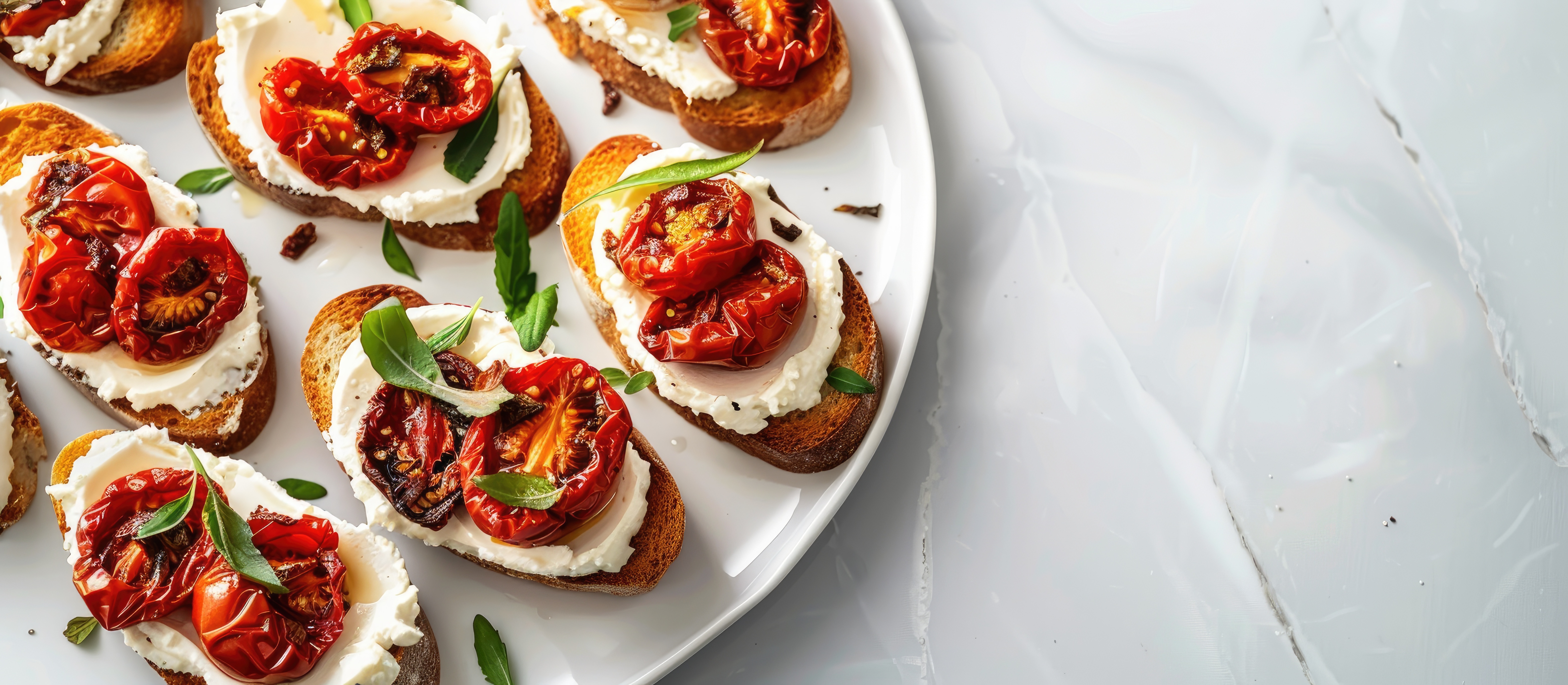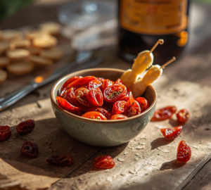 Des tomates cerises séchées, gorgées de soleil, sublimées par du basilic et une pointe d’ail.